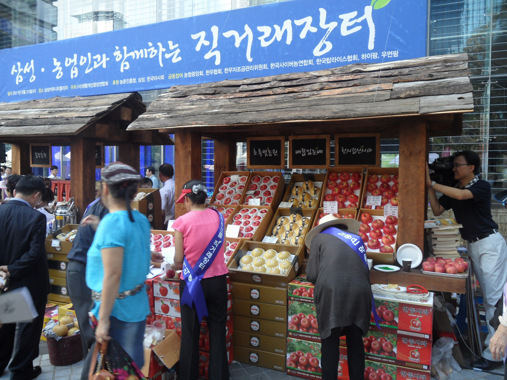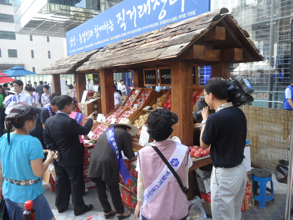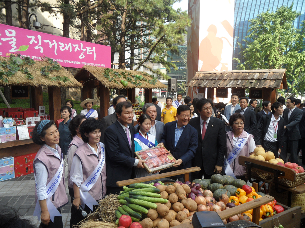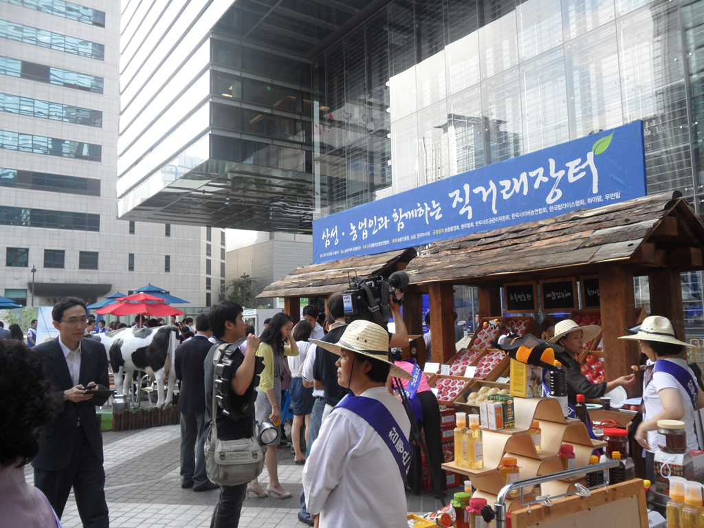 ¡ã 8¿ù31ÀÏ ¼¿ï ¼Ãʱ¸ »ï¼º ¼ÃÊ»ç¿Á È«º¸°ü ¡®µô¶óÀÌÆ®¡¯ ¾Õ ±¤Àå¿¡¼ »ï¼º°ú ³óÃÌÁøÈïûÀÌ °øµ¿À¸·Î °³ÃÖÇÑ ¡®³ó¾÷Àΰú ÇÔ²²ÇÏ´Â ¿ì¸® ³ó»ê¹° Á÷°Å·¡ ÀåÅÍ¡¯¿¡¼ ¹Î½Â±Ô(¿À¸¥ÂÊ µÎ¹øÂ°) ³ó¾÷ÁøÈïûÀåÀÇ ¾È³»·Î ±è¼øÅÃ(¡¨¼¼¹øÂ°) »ï¼º ¹Ì·¡Àü·«½ÇÀå, ÀÌÀ±¿ì(¿ÞÂÊ µÎ¹øÂ°) »ï¼ºÀüÀÚ ºÎȸÀå, ³²È£°æ ÇÑ¿ìÀÚÁ¶±Ý°ü¸®À§¿øÀå(¡¨ ³×¹øÂ°) µîÀÌ ³ó»ê¹°À» °í¸£°í ÀÖ´Ù.