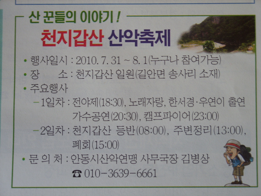 õÇÏ Á¦ÀÏÀÇ ¸í»êÀÎ ¾Èµ¿¡®ÃµÁö°©»ê »ê¾Ç ÃàÁ¦¡¯°¡ ¿À´Â 7¿ù 31ÀÏ(Åä) Àú³á 6½Ã 30ºÐºÎÅÍ 8¿ù 1ÀÏ(ÀÏ) ¿ÀÈÄ 1½Ã±îÁö 1¹Ú 2Àϰ£ ¾Èµ¿½Ã ±æ¾È¸é ¼Û»ç¸® õÁö°©»ê »ýŰø¿ø ÀÏ¿ø¿¡¼ °³ÃֵȴÙ.